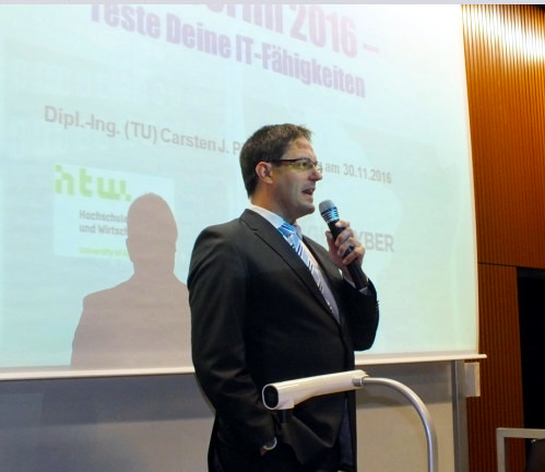 Dipl.-Ing. Carsten J. Pinnow, HTW-Lehrbeauftragter, Herausgeber von datensicherheit.de und Mitglied der Leitungsebene des VDI/VDE Arbeitskreises Sicherheit, führte in seinem Impulsvortrag aus, warum die Gefahr von Hacker-Angriffen in Zukunft noch zunehmen wird. Im Zuge der Vernetzung von Milliarden Geräten für das Internet der Dinge gehe es aber nicht allein um technische Aspekte bei Sicherheitsfragen, sondern auch die Faktoren „Mensch“ und „Management“ gelte es in Präventions- und Schutzmaßnahmen einzubeziehen.