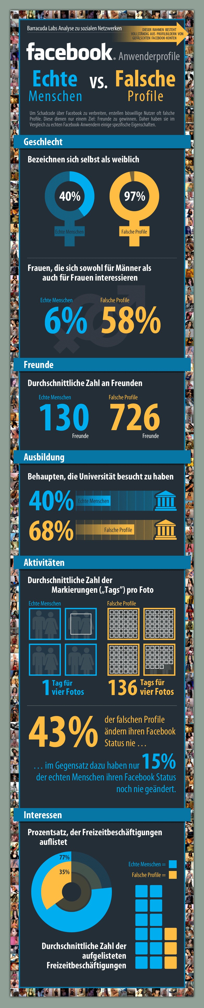 Dabei, so Dr. Judge, finde zwischen dem Netzwerk und denjenigen, die es für illegale Aktivitäten nutzen wollen, ein regelrechtes „Wettrüsten“ statt. Unter anderem habe facebook vor Kurzem eine Marketingfirma angeklagt, durch irreführende und täuschende Taktiken Spam zu verbreiten. Die neue Untersuchung der Barracuda Labs illustriert, wie Angreifer ihre Identitäten in Sozialen Netzwerken typischerweise gestalten.