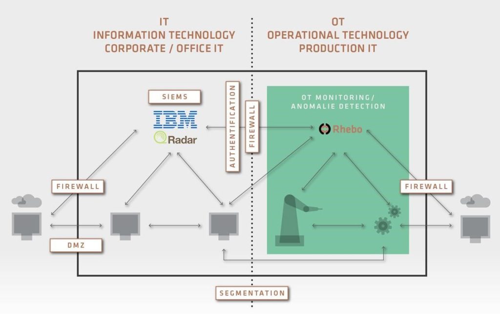 Die Firewalls blocken dann an den Netzwerkgrenzen unbekannte oder nicht autorisierte Vorgänge. Unbekannte oder neuartige Angriffsmuster, welche die Firewalls aushebeln, werden innerhalb der Netzwerksegmente von der Rhebo Anomalieerkennung erkannt, bewertet und gemeldet. Das IBM QRadar SIEM bildet die zentrale Verbindung zwischen den Schichten. Sie aggregiert und analysiert alle Meldungen. Als Ergebnis kann zum Beispiel die Firewall aktiv – und unabhängig vom externen Firewall-Anbieter – auf die neue Gefahr rekonfiguriert werden. Das ist insbesondere bei den immer häufiger auftretenden Zero-Day-Schwachstellen sowie für das eher schwierige Patch-Management in Produktionsumgebungen relevant.